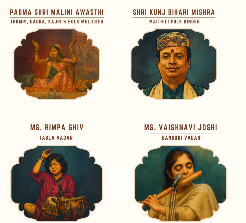 फेस्टिवल में पद्मश्री मालिनी अवस्थी की थुमरी, कजरी होगी। समृद्धि पाठक और सान्वी पाठक मैथिली लोकगीत गाएँगी। वाद्य यंत्रों पर रिम्पा, शिव तबला, वैष्णवी जोशी बांसुरी और मेघा राउत का सितार बोलेगा। बिहार और उत्तर प्रदेश की लोक परंपरा और संगीत की गहराई को तमाम कलाकार सेंट्रल पार्क में जीवंत कर देंगे।