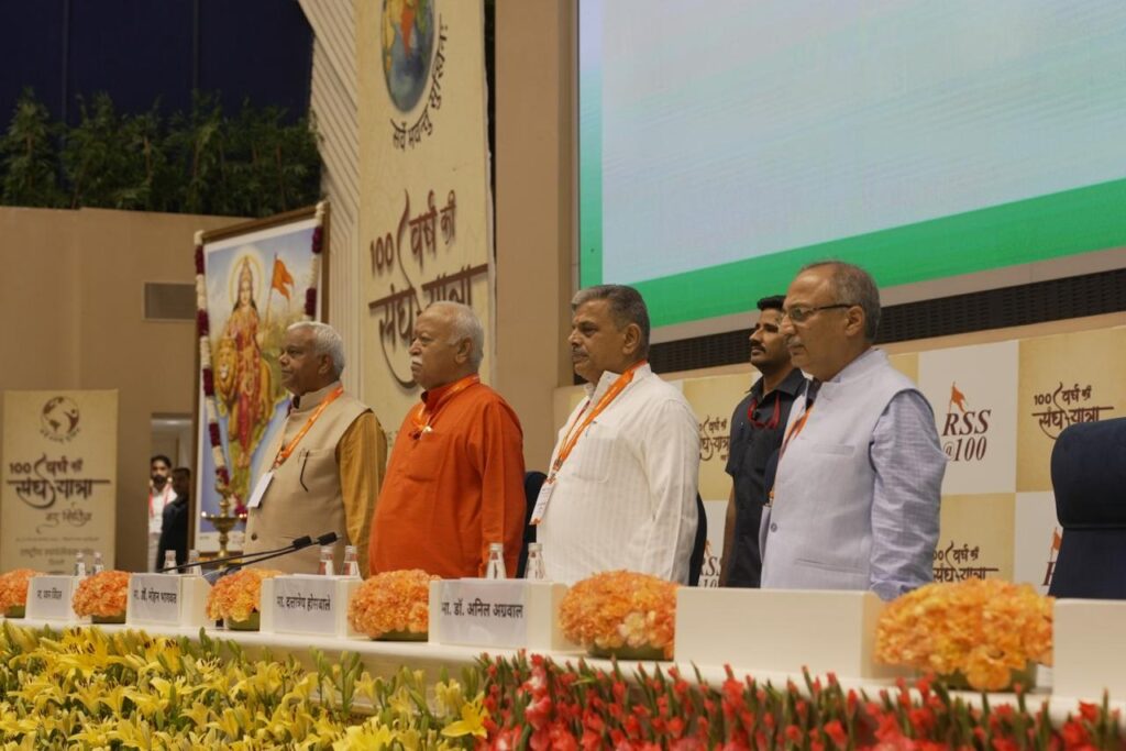 सरसंघचालक डॉ. मोहन भागवत संघ शताब्दी वर्ष के विज्ञान भवन में आयोजित तीन दिवसीय व्याख्यानमाला ‘100 वर्ष की संघ यात्रा – नए क्षितिज’ के दूसरे दिन संबोधित कर रहे थे। इस दौरान सरकार्यवाह दत्तात्रेय होसबाले, उत्तर क्षेत्र के प्रांत संघचालक पवन जिंदल और दिल्ली प्रांत संघचालक डॉ. अनिल अग्रवाल मंच मौजूद रहे