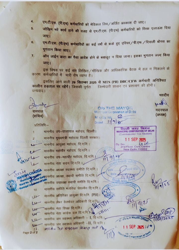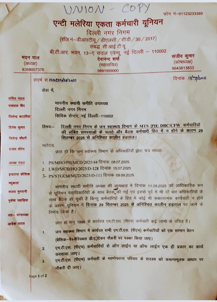 एंटी मलेरिया एकता कर्मचारी यूनियन ने ऐलान किया कि सभी साथी मजबूत तरीके से अपनी मांगों के लिए अपने बच्चों के लिए अपने भविष्य के लिए 29 सितंबर 2025 को सिविक सेंटर गेट नंबर 5 पर अपने बीवी – बच्चों और माता-पिता समेत अपनी अपनी मांगों को लेकर जरूर बैठेंगे। और जब तक हड़ताल नहीं उठाएंगे जब तक हमारी मांग का निवारण नहीं होगा। दिल्ली के समस्त MTS (PH) DBC/CFW कर्मचारी 29 सितंबर 2025 को समय 10:00 बजे दिल्ली नगर निगम मुख्यालय पर 30 सालों से लंबित अपनी मांगों को लेकर अनिश्चित हड़ताल करेंगे।