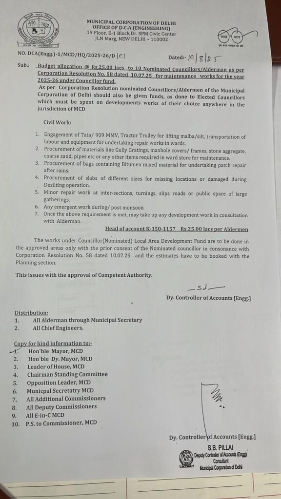 निगम में नॉमिनेटेड यानि नामित निगम पार्षद की संख्या 10 है। ये वो अनुभवी लोग हैं जो सदन को एक्सपर्ट सलाह देते हैं लेकिन एरिया में विकास नहीं कर सकते थे। हालांकि, अब ऐसा नही है 10 जुलाई को निगम की बैठक में जो प्रस्ताव पास हुआ था उसके मिनट्स अब कंफर्म हो चुके हैं। निगम ने Head of account K-150-1157 तय करके 25 लाख रूपए दे दिये हैं लेकिन शर्त है कि ये फंड अप्रूव्ड एरिया में ही खर्च किये जा सकेगें वो भी चुने हुए पार्षद की रज़ामंदी जरूरी होगी।