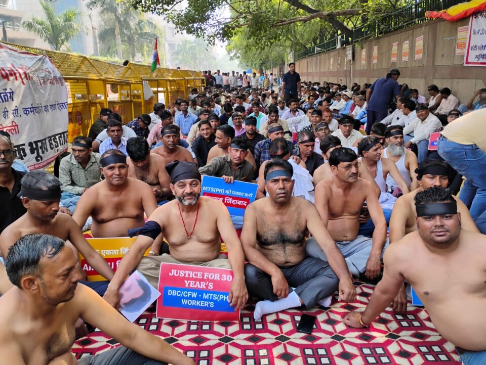 दिल्ली नगर निगम के जन स्वास्थ्य विभाग के DBC/CFW (MTS) कर्मचारी 29 सितंबर 2025 से अनिश्चितकालीन हड़ताल पर हैं। 17 अक्टूबर को यह आंदोलन 19वें दिन में प्रवेश कर चुका है—दिन-रात, बिना रुके। कर्मचारियों की मांगें सिर्फ वेतन या सुविधा नहीं, बल्कि सम्मान और स्थायित्व की हैं। आज 19 वें दिन कर्मचारी निगम के बेरुखी के कारण अपने बच्चों को हिंदुओं से इतने बड़े पर्व दिवाली कपड़े रोटी न दिलवाने के कारण खुद भी कपड़े उतार कर बैठ गया है।साथ ही साथ रोष प्रकट करते हुए काली पट्टी बांधी है।