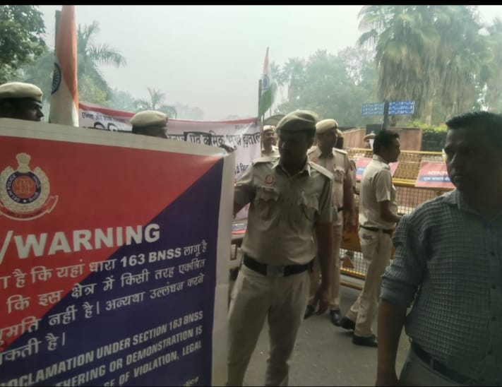 डेंगू-मलेरिया को खत्म करने वाले दिल्ली नगर निगम के जन स्वास्थ्य विभाग के एमटीएस (मल्टी टास्किंग स्टाफ) कर्मचारी 29 सितंबर अनिश्चितकालीन हड़ताल पर बैठे हैं। आज 32 वें दिन भी हड़ताल जारी है। अलसुबह धरना स्थल पर पहुंचे दिल्ली पुलिस के दस्ते ने मौके पर BNS धारा वाले पोस्टर के साथ तैनात हो गए।