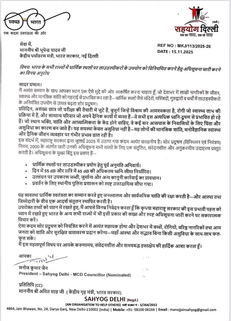 सहयोग दिल्ली के अध्यक्ष एवं MCD Councillor (Nominated) मनोज कुमार जैन ने आज केंद्रीय पर्यावरण मंत्री भूपेंद्र यादव को एक पत्र लिखकर देशभर में धार्मिक स्थलों पर लाउडस्पीकरों के अनियंत्रित उपयोग से उत्पन्न शोर प्रदूषण को नियंत्रित करने हेतु समान राष्ट्रीय दिशा-निर्देश जारी करने की मांग की है।
