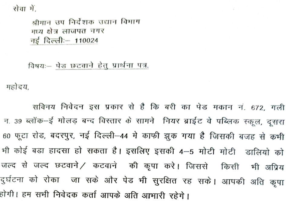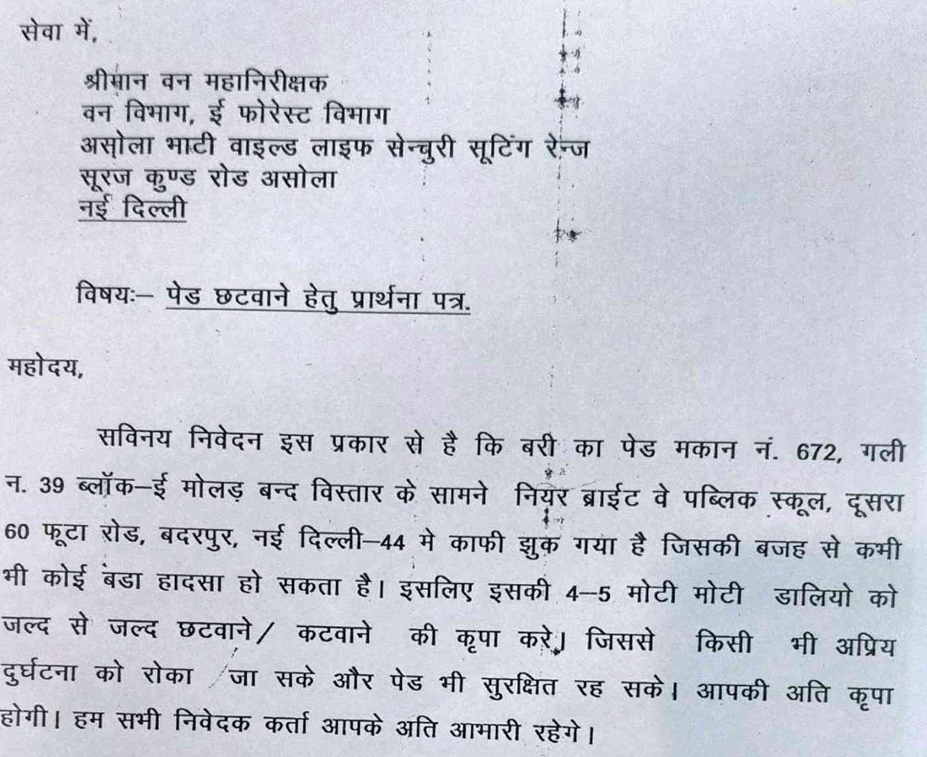 इलाके में करीब 40 सालों से मौजूद ये पेड़ इलाके के लोगों के लिये ऑक्सीजन का बड़ा स्रोत है। झुकने से पहले तक जीवन देने वाला ये पेड़ इलाके को लोगों के लिए डर का बड़ा सबब बन चुका है। खासकर कालकाजी की घटना के बाद से रहवासी डरे हैं। बरी का ये पेड़ मकान नंबर 672, गली नंबर 39, ब्लॉक E मोलर मोलड़बंद विस्तार के सामने नियर ब्राइटवे पब्लिक स्कूल, दूसरा 60 फुटा रोड बदरपुर नई दिल्ली 44 में स्थित है। जो काफी झुक गया है जिसकी वजह से कभी भी कोई बड़ा हादसा हो सकता है। वन विभाग को दी गई शिकायत के मुताबिक इलाके के लोगों ने गुहार लगाई कि 4-5 मोटी डालियों को जल्द से जल्द काटा या छांटा जाए ताकि पेड़ भी सुरक्षित रहे। और किसी भी दुर्घटना को रोका जा सके। कुछ असोला भट्टी वाइल्डलाइफ सैंचुरी शूटिंग रेंज सूरजकुंड रोड असोला स्थित वन विभाग के ई फॉरेस्ट विभाग जो चिट्ठी लिखने के बाद भी कोई कारर्वाई नहीं हुई।
