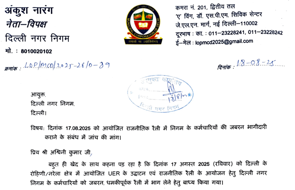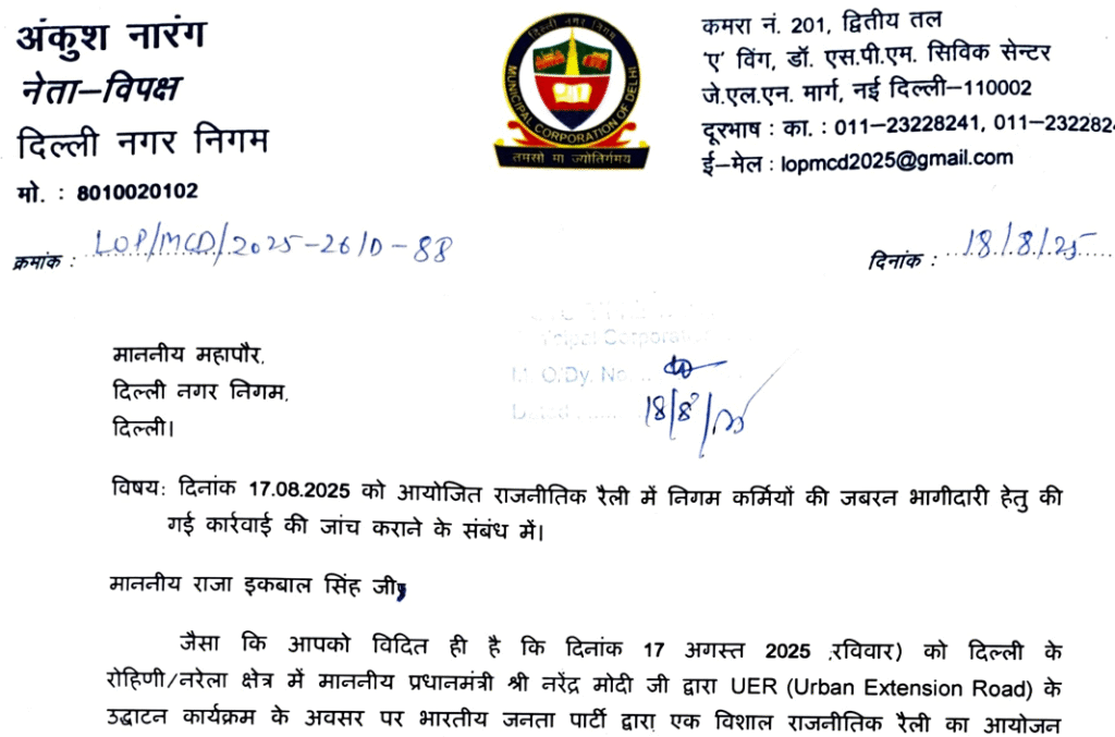 निगम कर्मचारियों को मोदी रैली में भेजने वाले के खिलाफ कार्रवाई की मांग; LOP ने मेयर, कमिश्नर को लिखी चिट्ठी