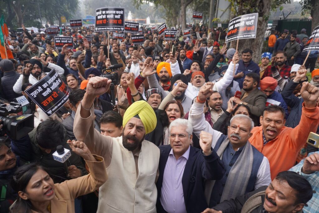 दिल्ली भाजपा कार्यकर्ताओं ने आज राष्ट्रीय महामंत्री तरूण चुघ के नेतृत्व में दिल्ली विधानसभा में नेता प्रतिपक्ष आतिशी मार्लेना द्वारा सिख गुरू तेगबहादुर साहिब के अपमान के विरोध में आम आदमी पार्टी कार्यालय पर विशाल रोष प्रदर्शन किया। बड़ी संख्या में दिल्ली भाजपा के सिख प्रकोष्ठ के कार्यकर्ता भी प्रदर्शन में सम्मिलित हुए।